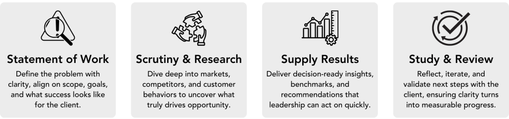 We transform research into executive ready stories that drive decisions. This helps our clients be ready to execute as soon as we deliver.